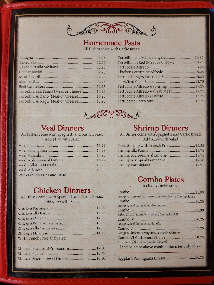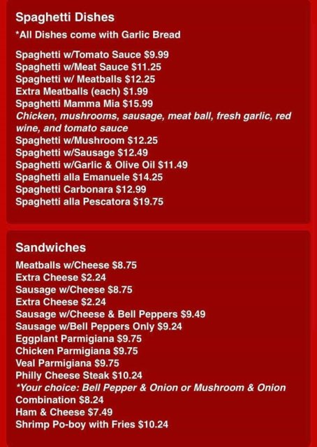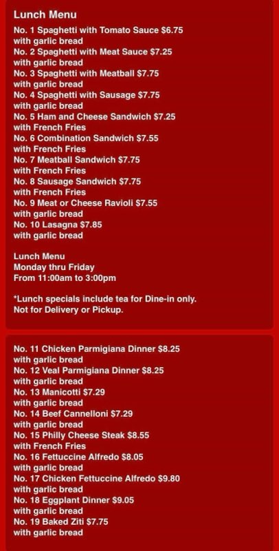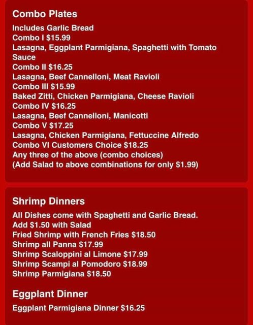 The menu showcases standout specialties like the Seafood Fettuccine and Rigatoni Alla Vodka, each dish exuding authenticity. You'll find Combo Plates brimming with options, from mouthwatering Lasagna and Beef Cannelloni to Chicken Parmigiana, all served with warm garlic bread. Perfect for families, the Kids Menu offers customizable pizzas tailored to young palates.