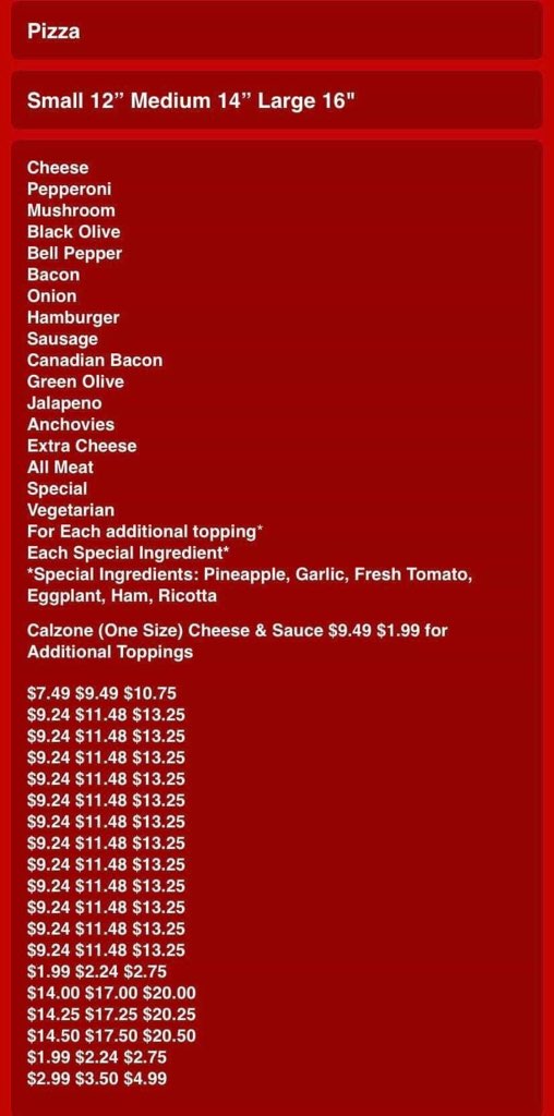 2.24 Each Extra Ingredient : Pepperoni, Mushroom, Black Olive, Green Olive, Bell Pepper, Bacon, Onion, Hamburger, Sausage, Canadian Bacon, Jalapeno, Anchovies
