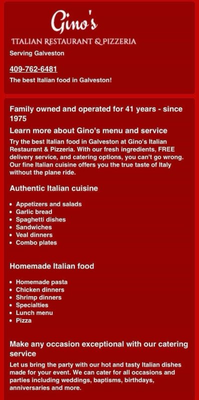Welcome to Gino's Italian Restaurant and Pizzeria, a cherished gem nestled in Galveston, TX. With over 50 years of family-owned tradition, Gino's invites you to indulge in a delightful array of Italian cuisine, crafted with rich flavors and generous portions.
